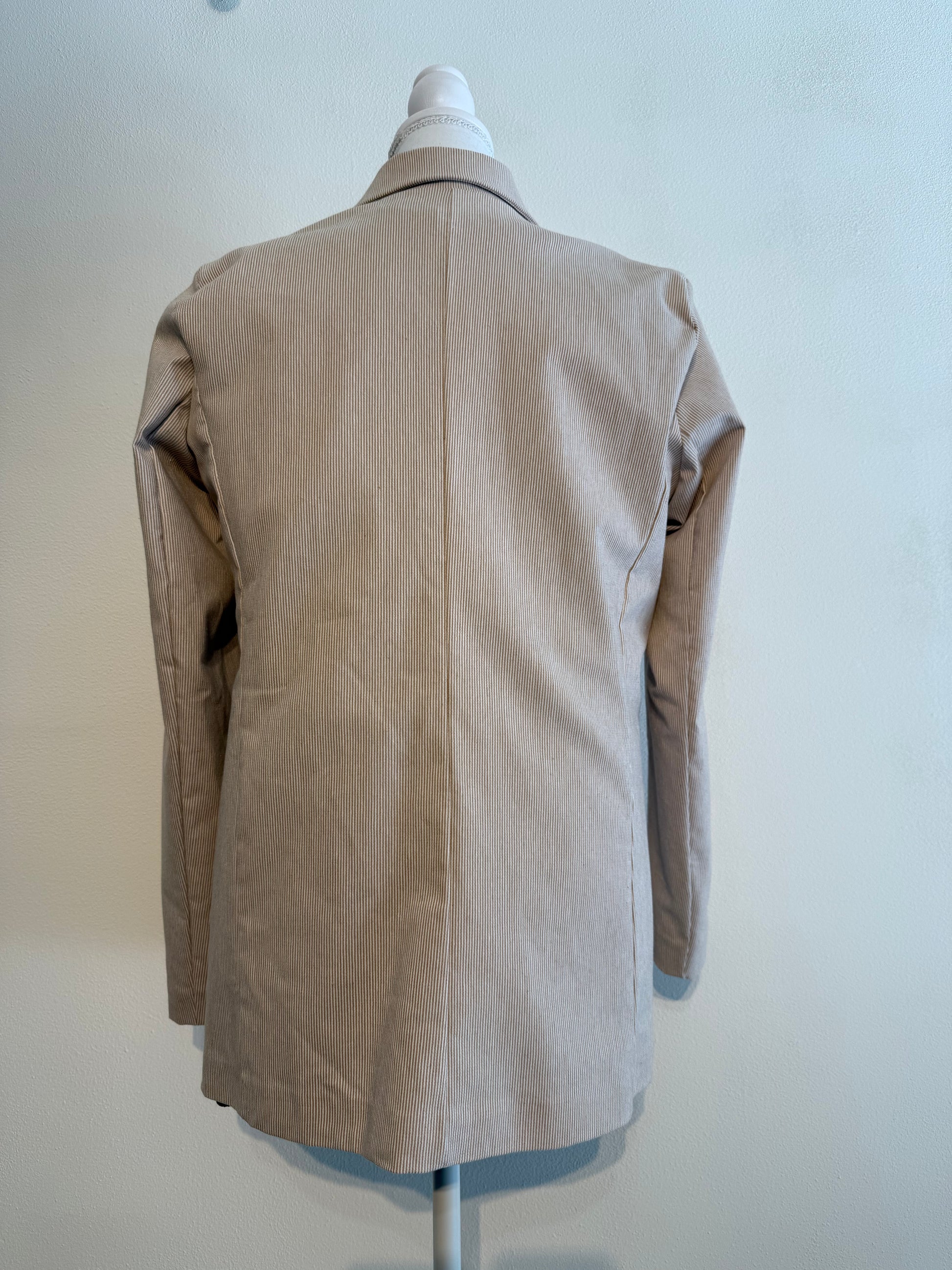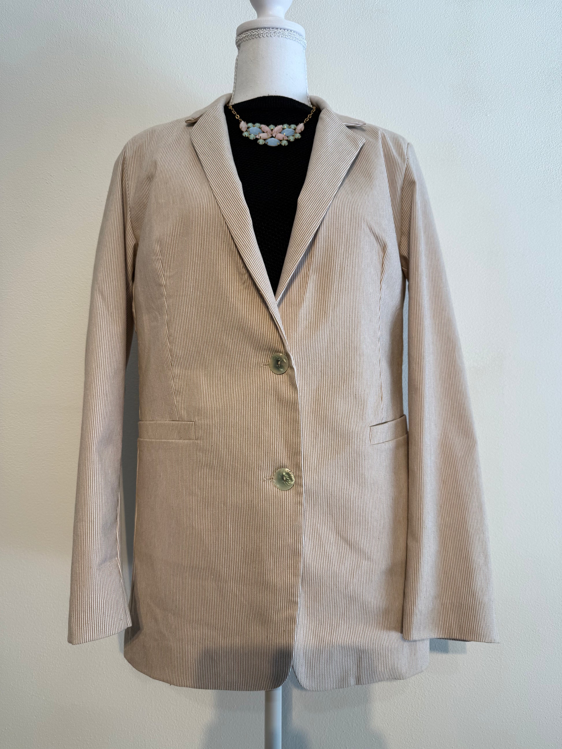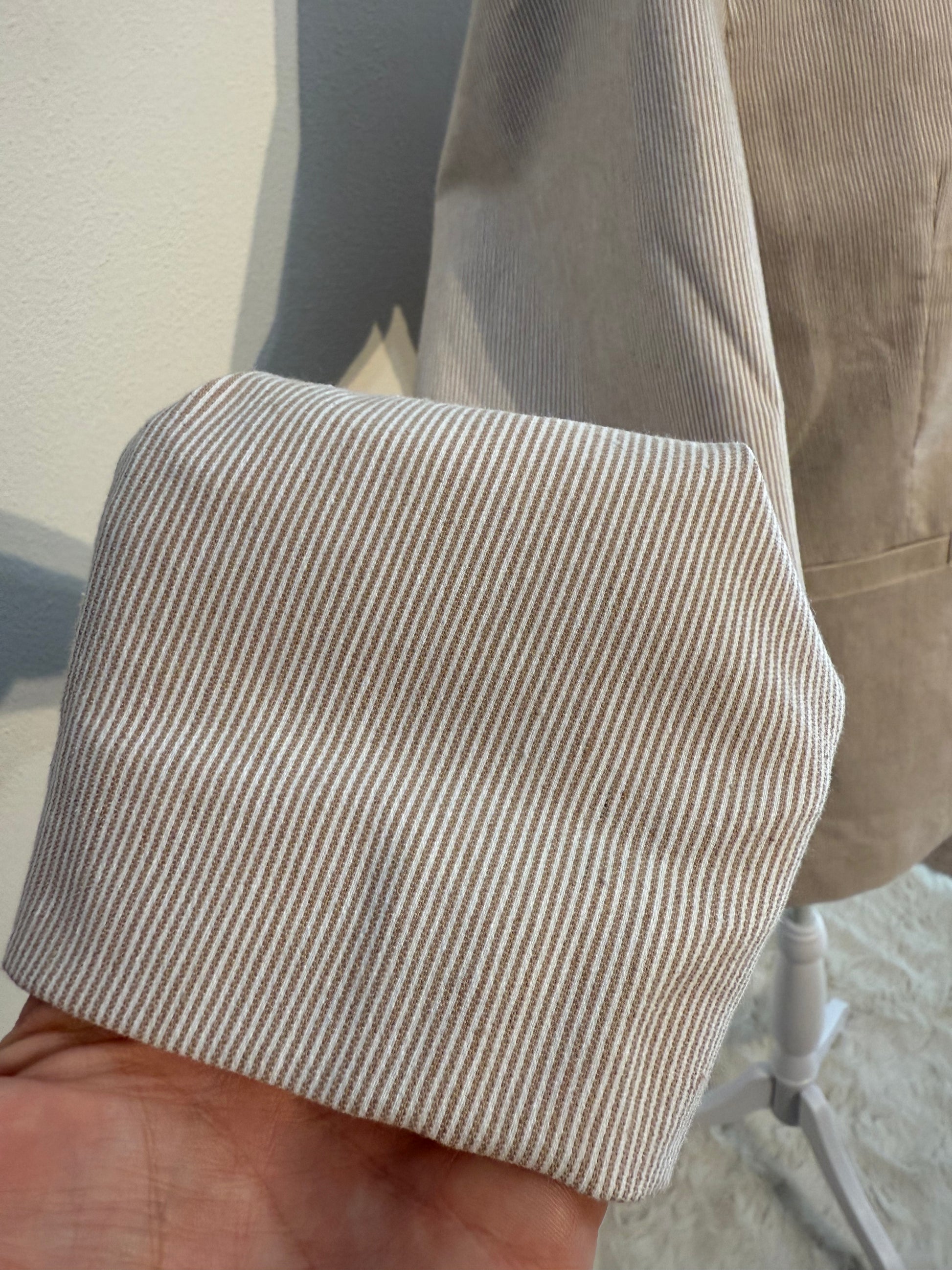 Bazer da donna in tessuto leggero con micro righe beige/avorio (effetto seersucker, fresco e confortevole). Linea classica, monopetto, perfetta per primavera/estate e look smart casual.
