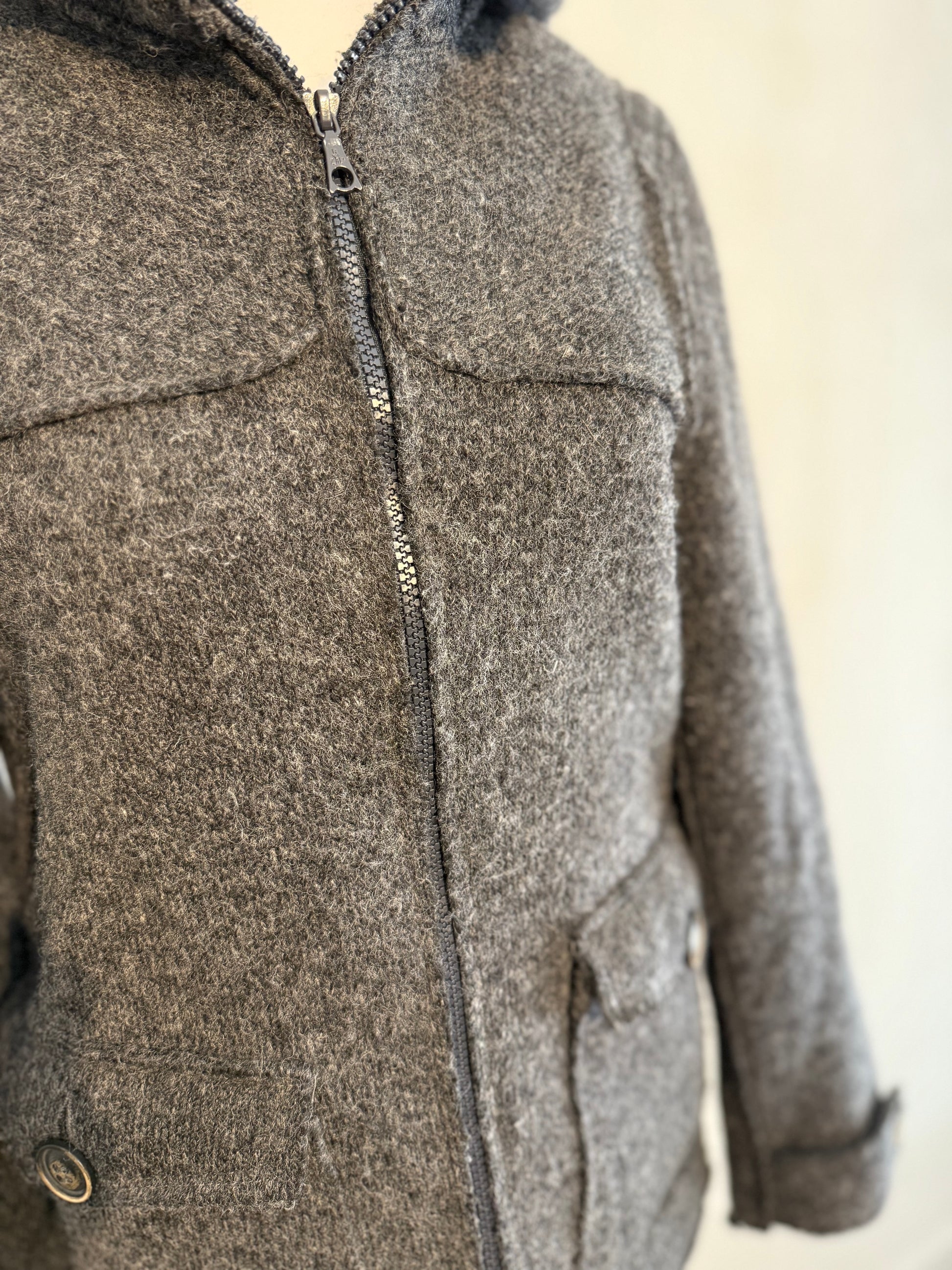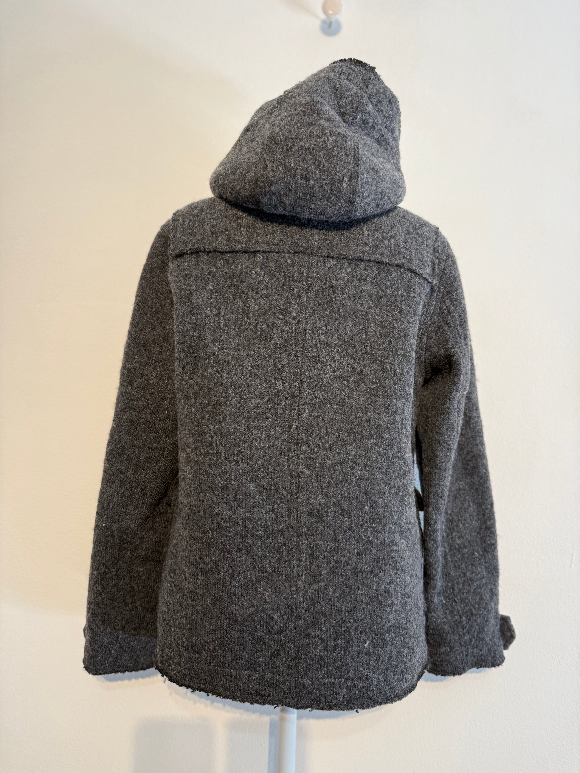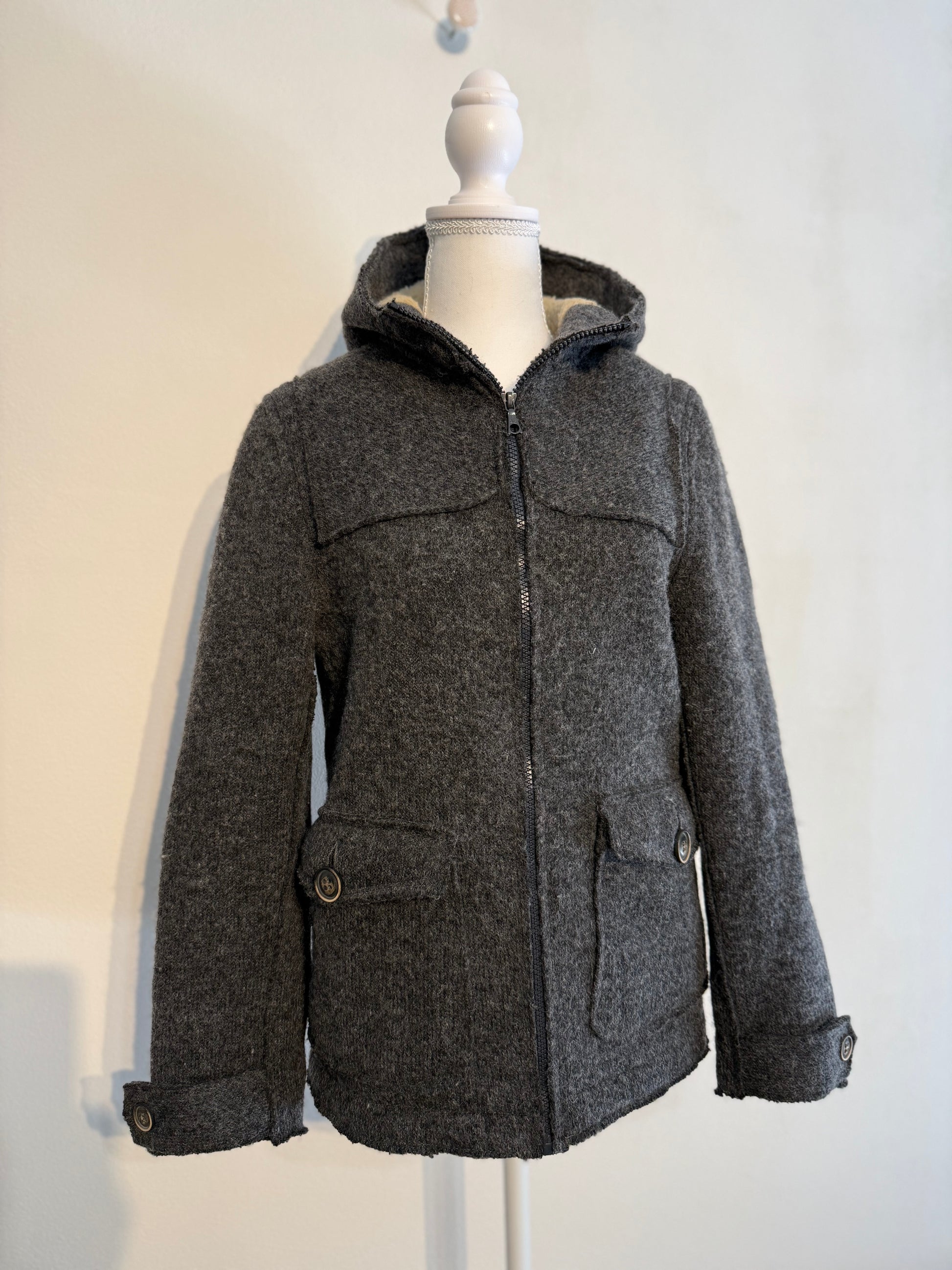 Giacca in lana mista di colore grigio scuro, con cappuccio e fodera interna in morbida pelliccia sintetica effetto shearling, ideale per l’inverno.